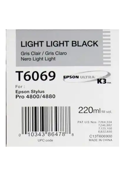 Epson T6069-C13T606900 Light Light Black Original Cartridge is designed for compatible Epson Stylus Pro printers, producing smooth grayscale tones, consistent performance, and dependable print quality for professional large-format printing.