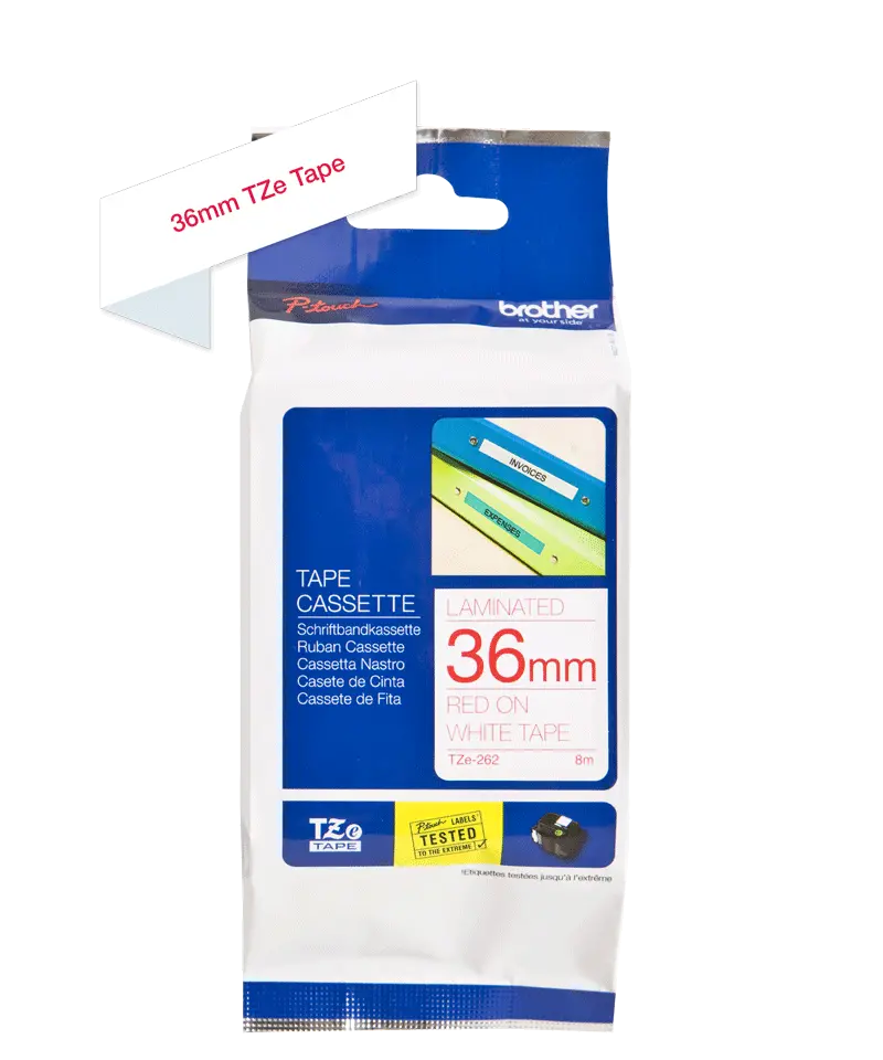 TZe-262 36mm Magenta on White Laminated Label is designed for P-touch label printers, providing clear magenta text on a white background with a durable laminated protective layer for professional and industrial labeling applications.