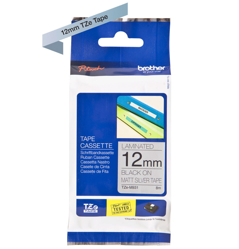 TZe-M931 12mm Black on Matte Silver Label is designed for P-touch label printers, providing clear black text on a matte silver background with strong adhesion and a premium professional finish.